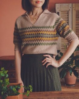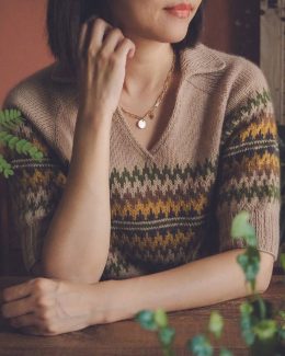 Этот пуловер выполнен из мягкой пряжи с выразительным жаккардовым узором в оттенках горчичного, зеленого и бежевого. Особенностью изделия является глубокий V-об...