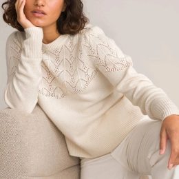 Свитер выполнен из плотной пряжи с выразительным листовым ажурным узором, создающим интересную текстуру и легкую прозрачность. Особенность изделия — крупные отв...
