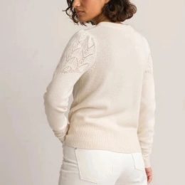 Мягкий свитер кремового цвета с изящным ажурным узором на груди и рукавах, выполненный из тонкой пряжи. Особенность модели — аккуратные резинки на манжетах и по...