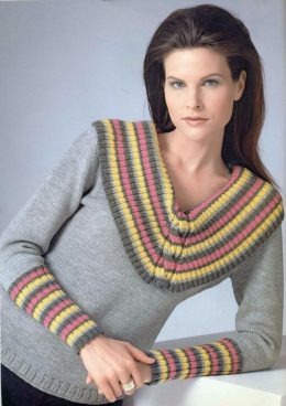 Привет, любители оригинального стиля! Этот серый пуловер с широкой полосатой кокеткой и манжетами — настоящий маст-хэв для тех, кто не боится выделяться. Уникал...