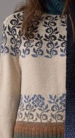 Теплый свитер с оригинальным узором из завитков, выполненным в технике жаккарда. Модель из мягкой пряжи кремового цвета с контрастным синим и темно-синим орнаме...