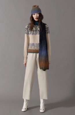 Крупные рельефные ромбы создают выразительный объем и подчеркивают контрастные цветовые переходы между верхней и нижней частями пуловера, придавая модели уникал...