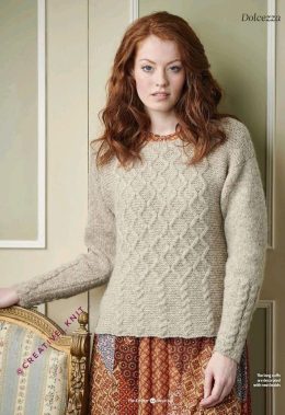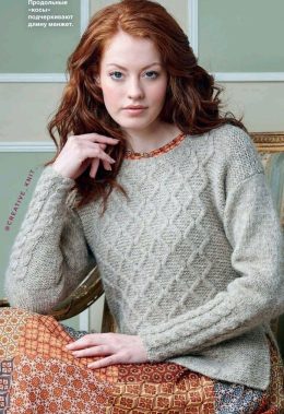 Этот пуловер связан спицами из мягкой пряжи с выразительным объемным узором, который создает эффект плетения. Особенность модели — глубокий V-образный вырез с о...