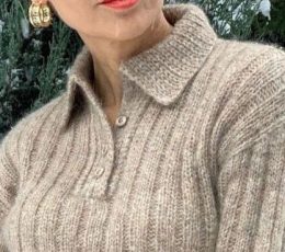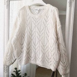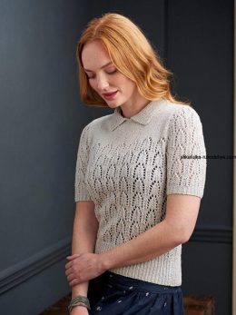 Этот пуловер выделяется изящным ажурным узором, который придает изделию легкость и воздушность, а аккуратный вязаный воротник добавляет классическую нотку. Рука...