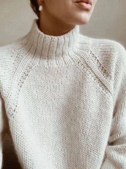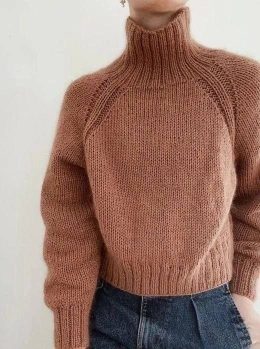 Спицами выполненный свитер из мягкой пряжи с выразительным высоким горлом и рельефным регланом, создающим элегантный силуэт. Особенность модели — объемные рукав...