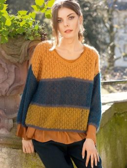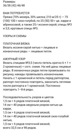 Изделие выполнено из мягкой мохеровой пряжи с выразительным ажурным узором, который придает легкость и воздушность. Особенностью модели является сочетание трех...