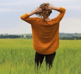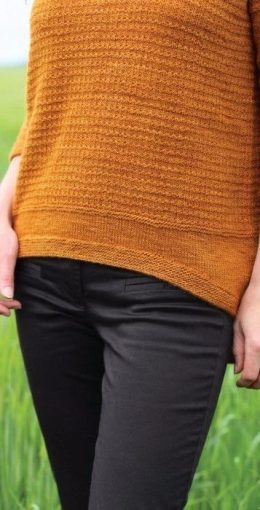 Этот пуловер, связанный спицами, выделяется оригинальной структурой в зоне горловины, где вертикальные рельефные полосы создают эффектный акцент. Модель выполне...