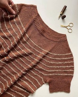 Этот пуловер выделяется своей текстурной вязкой с чередующимися тонкими полосами, создающими стильный морской мотив. Короткие рукава и плотный ребристый край пр...