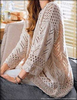 Изделие выполнено из тонкой пряжи с изящным ажурным узором, имитирующим плавные волны. Свободный крой и слегка укороченная длина создают эффект легкости и возду...