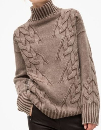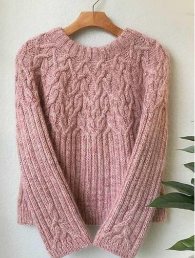 Этот вязаный свитер удивляет своими сложными узорами, которые плавно переходят от горловины к телу. Тонкий розовый оттенок и объемные косы придают изделию элега...
