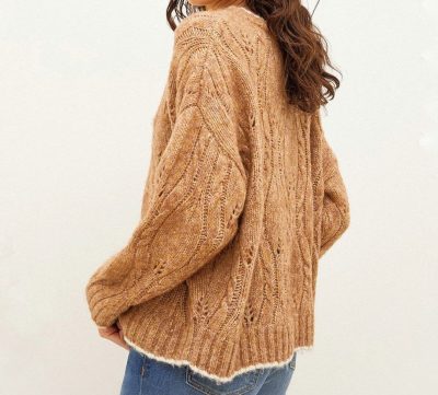 Этот свитер связан спицами с неожиданным элементом в виде ажурного узора, который добавляет изысканности. Теплый оттенок напоминает пряные осенние листья, а объ...