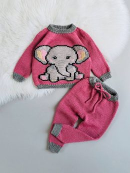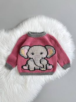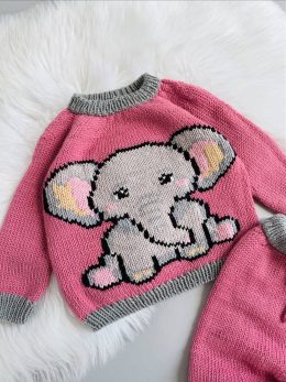 Яркий розовый цвет с контрастными серыми манжетами, воротником и нижней частью. Вышитый мультяшный слон с выразительными глазами, розовыми ушками с желтыми серд...