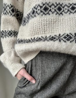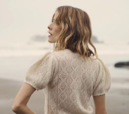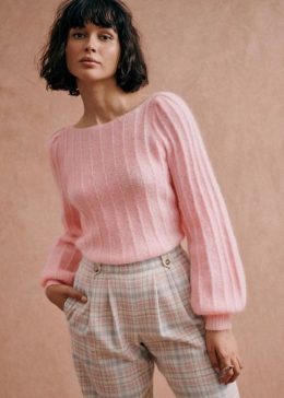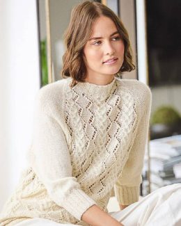 Особенность модели — мягкий воротник-стойка и аккуратные рукава с тонкими ребристыми вставками, подчеркивающими линию плеч. Использование экологичных пряж с доб...