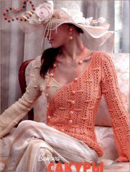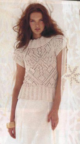 Пуловер из чистого шёлка связан на спицах роскошным узором из ромбов, а кружевные планки по нижнему краю и на рукавах и вырез горловины обвязаны крючком...