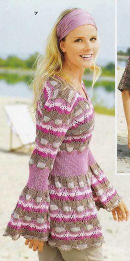Приталенный пуловер с расклёшенными рукавами Размеры: 38/40 (42/44) Вам потребуется: 250 (300) г коричневой, по 150 (200) г бежевой и цвета розового дере...