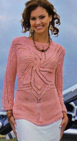 Розовый свитер вязание спицами Размер: 40/42 (о/г 91-96 см, о/б 98-102 см) Вам потребуется: 500 г абрикосово-белой меланжевой ленточной пряжи (100% хлопка, 90 м...
