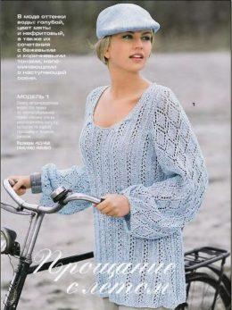 Голубая туника вязаная спицами Размеры: 40/42 (44/46) 48/50. Вам потребуется: 750 (800) 850 г голубой пряжи Alpha (100% хлопка, 104 м/50 г); спицы и крюч...
