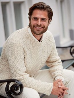 Классический мужской пуловер, выполненный из чистой шерсти с использованием традиционных узоров "косы" и двойного жемчужного рисунка. Особенность модели — сочет...