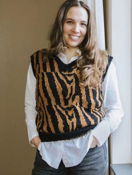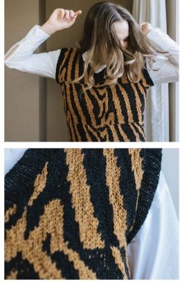 Этот вязаный жилет поражает своим уникальным дизайном: тигровый узор в контрастных черных и золотистых тонах. Каждая петля подобрана с любовью, создавая эффектн...