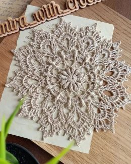 Эта салфетка привлекает внимание своим сложным геометрическим узором и тонкой вязкой. Уникальные детали включают в себя восьмиугольные и ромбовидные мотивы, кот...