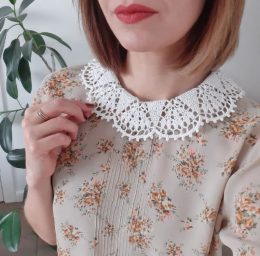 Изысканный кружевной воротник с изящным узором и аккуратным заострённым краем, придающий образу утонченность и винтажный шарм. Нежный воротничок