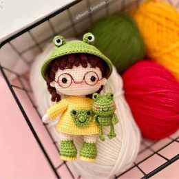 Кукла одета в желтую кофточку с изображением лягушек и носит зеленую шляпу с забавными глазками. В руках она держит маленькую игрушечную лягушку, что придает об...
