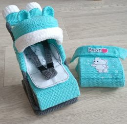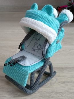 Эта очаровательная вязаная коляска с капюшоном и милым медвежонком непременно вызовет улыбку! Прекрасно детализировано, с ремнями безопасности и уютным одеялком...