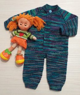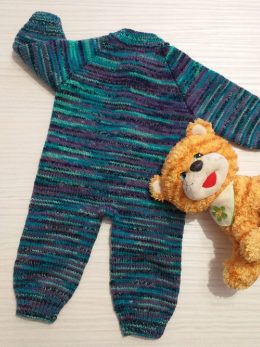 Этот детский вязаный комбинезон выполнен из мягкой пряжи с использованием разноцветных полосок в оттенках синего, зелёного и фиолетового. Особенностью изделия я...