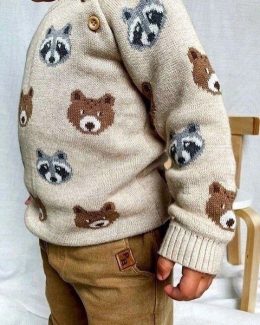 Вязаный свитер из мягкой пряжи украшен оригинальным узором с изображением лиц медведей и енотов, что придаёт изделию игривый и уютный вид. Особое внимание уделе...