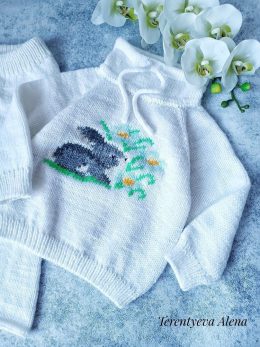 Уникальный детский комплект, связанный спицами из мягкой пряжи, включает теплые брюки с эластичным поясом и свитер с высоким воротником и завязками. Особенность...