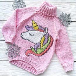 Нежный розовый свитер с объемным узором единорога, украшенный ярким разноцветным рогом и гривой, создаёт атмосферу сказки и радости. Мягкая пряжа и аккуратная в...