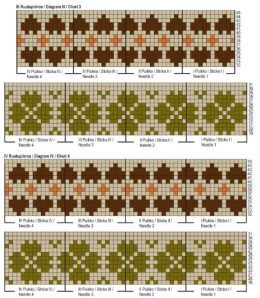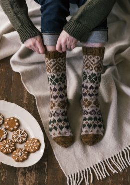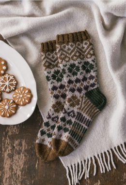 Носки с традиционным северным узором, выполненные из мягкой пряжи с коричневыми, зелеными и бежевыми оттенками. Особенность — сложный геометрический рисунок с с...