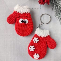 Какая прелесть! Эти вязаные красные варежки-брелоки с белыми снежинками и пушистой манжетой выглядят очаровательно. Забавные глазки и улыбка придают им живой ха...