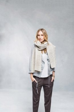 Этот связанный спицами шарф удивит вас своей неожиданной текстурой, напоминающей пушистое облако. Его крупная вязка и нежный кремовый оттенок делают его идеальн...
