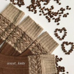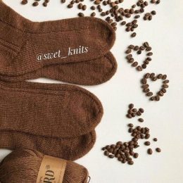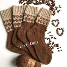 Контраст между светлой и тёмной пряжей привлекает внимание к этим вязаным носкам. Узор из кофейных зерен и аккуратные манжеты создают уютный и стильный образ дл...