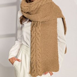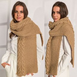 Этот роскошный шарф связан спицами и идеально подходит для холодных дней! Обратите внимание на сложный узор, который добавляет изюминку, и мягкий карамельный цв...