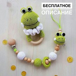 Эта очаровательная игрушка ручной работы приглашает в мир забавных приключений с милыми лягушатами. Мягкий вязаный погремушка и держатель для соски в виде лягуш...