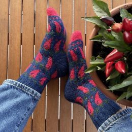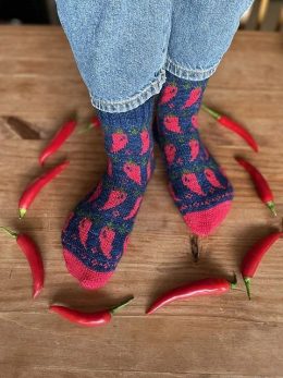 Пусть ваши дни будут такими же яркими и уютными, как эта пара носков! Вязаные носки с узором красных перчиков на синем фоне добавляют красок и веселья. Завершае...