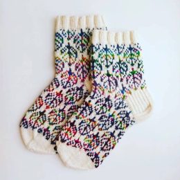 Эти вязаные носки из мягкой шерсти украшены изысканным ажурным узором, напоминающим снежные узоры на окнах. Их кремовый цвет и тонкая работа делают их поистине...