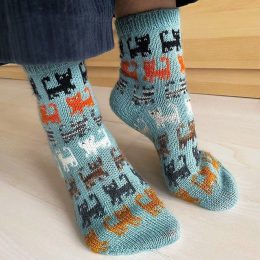 Эти вязаные носки выполнены из мягкой пряжи нежно-голубого цвета и украшены множеством маленьких котиков разных оттенков — черных, рыжих, белых и коричневых. Ун...