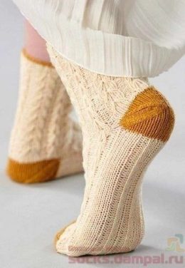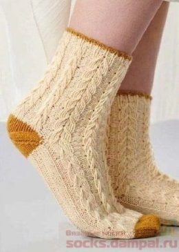 Изящные носки выполнены из мягкой пряжи кремового цвета с выразительным узором косы и контрастными горчичными пятками и носками. Особое внимание уделено деталям...
