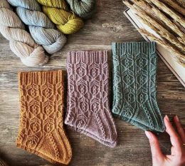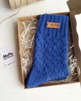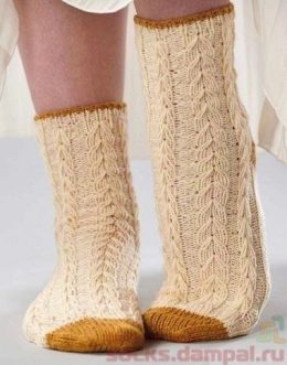 Эти носки выполнены из мягкой пряжи с детальной вязкой, включающей сложные переплетения и рельефные элементы, которые подчеркивают элегантность и тепло изделия....