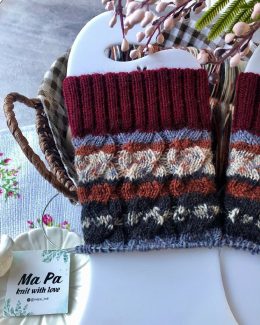 Эти вязаные митенки выполнены из теплой пряжи с выразительным узором косы, который чередуется с разноцветными полосами терракотового, серого и черного оттенков....