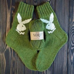 Эти зелёные носки выделяются мягкой текстурой и оригинальной вышивкой в виде белого зайца с выразительными ушами и бантиком. Использование пряжи DROPS NORD прид...