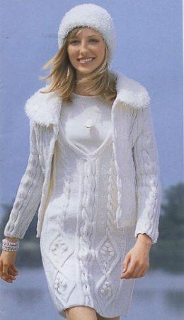 Платье, жакет и шапочка Размеры: 34/36 (38/40) Вам потребуется: для платья 350 (400) г и для жакета 450 (500) г белой Only Stretch (40% овечьей шерсти, 30% по-л...