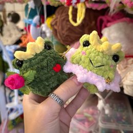 Как насчет свидания в пруду? Эти милые вязаные лягушата в коронах готовы к романтическим приключениям. Один из них держит розу, а другой — в розовом наряде. С т...