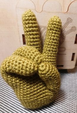 Бросок креативности — эта вязаная рука в форме жеста «мир» оживает в мягком оливковом оттенке. Изящно выполненные пальцы и текстурированные петли добавляют изде...