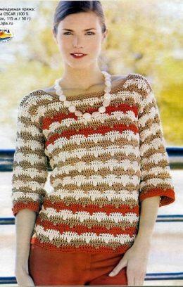 Полосатый вязаный пуловер крючком Размер 48 Вам нужно: По 200 г тонкой хлопчатобумажной пряжи песочного и кремового цветов и 80 г пряжи красного цвета. К...