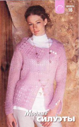 Розовый пуловер вязаный крючком Размеры: 36/38 (40/42) 44/46 Вам потребуется: 200 (250) 300 г розовой пряжи Soft-Kid (70% королевского мохера, 25% полиам...