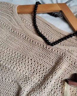Изделие украшено черными бусами, добавляющими контраст и элегантность. Текстура вязки создает ощущение легкости и воздушности, идеально подходя для теплой погод...